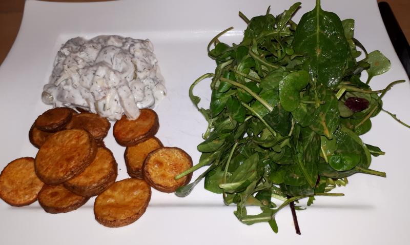 Matjes in Joghurtsoße mit Backofenkartoffeln und verschiedenen Blattsalaten