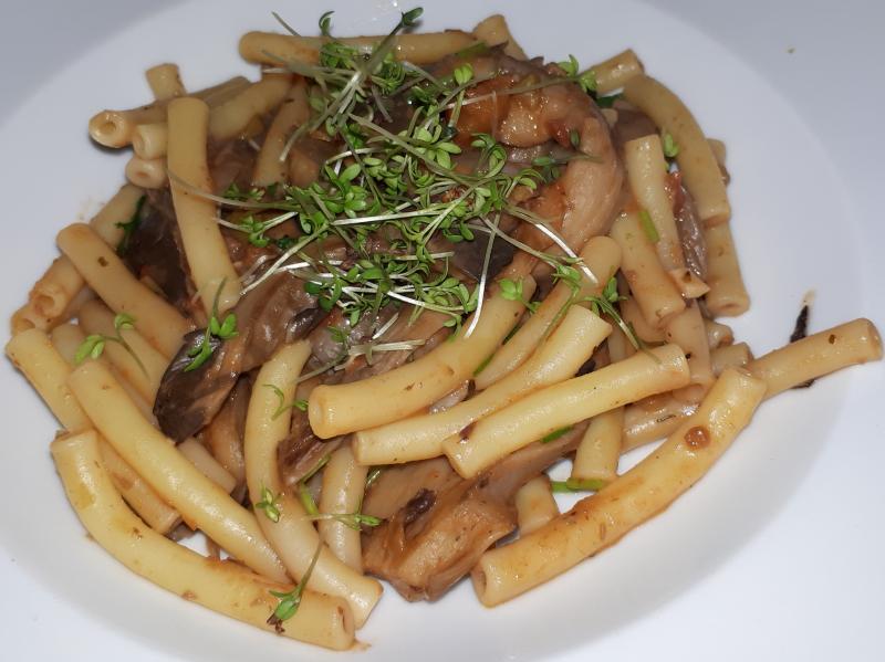 Maccheroni mit Austernpolzen, Oliven und Tomaten, dazu Endivien