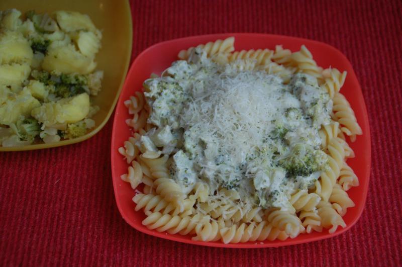 Spirellen mit Broccolisoße (Butter, Broccoli, Frischkäse, Thymian, Salz, roter Pfeffer, Lorbeer) und Parmesan
