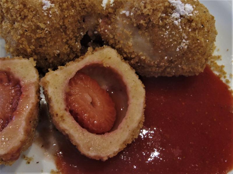 Heute gab es Spargelsuppe und Erdbeerknödl. Weil mir da meist im Verhältnis zur Erdbeere (die beim Kochen schrumpft) zu viel Teig ist bzw. er sich sich so dünn machen läßt wie bei z.B.Marillen, hab ich noch gemixte Erdbeeren dazugegeben.