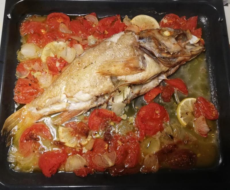 Letzte Woche hatte ich beim Fischhändler auf dem Markt einen ganzen Rotbarsch gekauft. Kaum eingepackt, erhielt ich von GG die Nachricht, dass er auf dem Weg zum Boot sei. Also habe ich das Vieh eingefroren und heute dem wieder heimkehrenden Gatten aufgetischt. Gefüllt mit Zitrone, Zwiebel, Knoblauch, Rosmarin und Thymian und umgeben von etlichen Gartentomaten und dem Rest der Füllung.