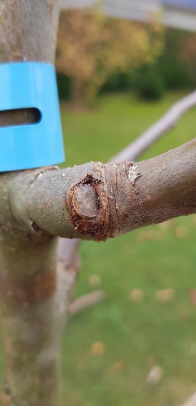 Wenn der Baum eine doofe Wunde hat, dann die knapp über dem Etikett auf dem ersten Bild. Da wurde nicht sauber auf Astring geschnitten, unten fehlt zu viel. Bei der Größe macht das aber noch nicht viel. Und linksrum sind die Leitungsbahnen frei nach oben, rechtsrum sind sie behindert. Hätte man alles vermeiden können mit Konkurrenzknospe ausbrechen nach dem Anschnitt letztes Jahr.