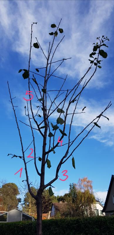 Nun folgt ein Foto von unten fotografiert. Ich hoffe man erkennt es. Der Baum hat daraufhin links zwei neue Triebe gebildet und nun müsste ich mich ja für einen entscheiden. Beide sind allerdings wieder recht steil gewachsen. Könnte da wieder Konkurrenz entstehen? Ich hatte im Sommer leider nicht wirklich Zeit die Äste zu lenken...