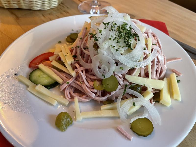 sehr guter wurstsalat mit käse in einer sehr sympathischen weinstube