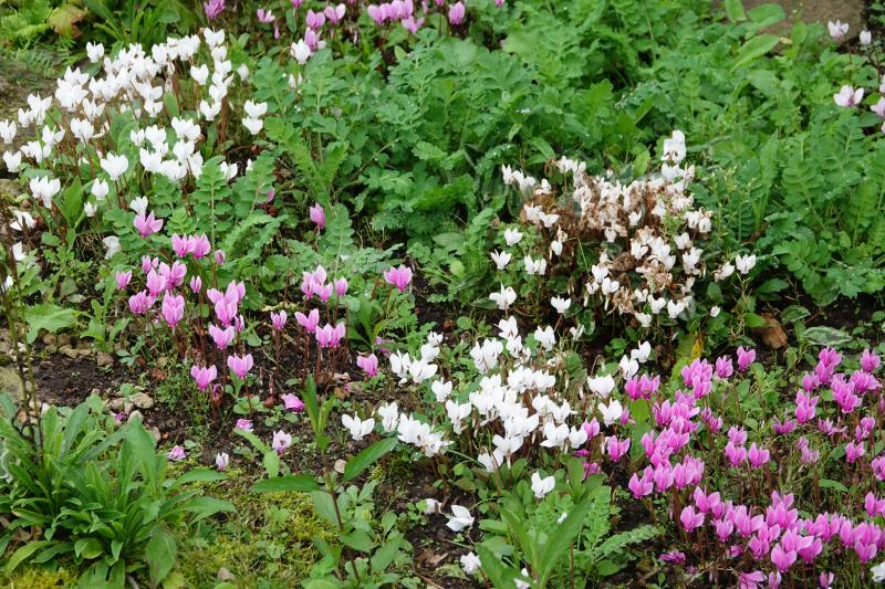 Anemonopsis macrophylla ´Alba´und weißblühende Cyclamen hederifolium.