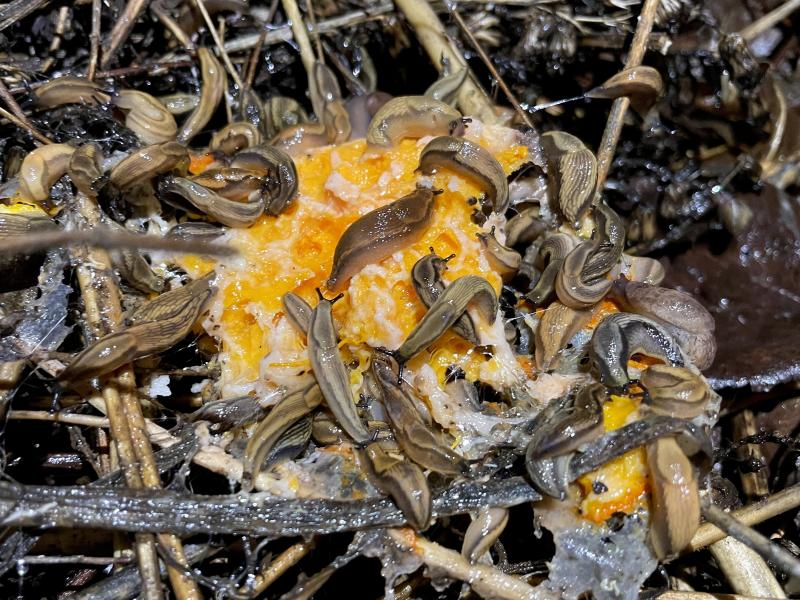 eigentlich wollte ich eben nur ganz schnell die leeren kunststoffgießkannen einräumen, auf dass der orkan keinen unfug damit treiben kann – die prioritäten verschoben sich nach einem blick auf den kompost. letztens warf ich ein stück im winterquartier angegammelten hokkaido darauf. :P