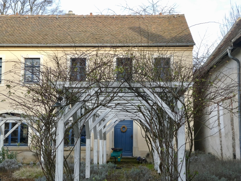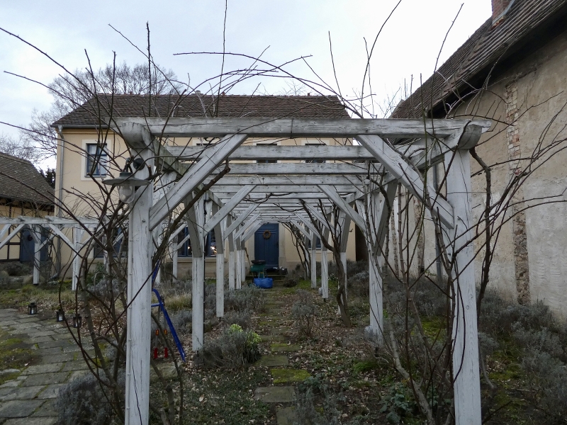 Rückschnitt im Hof, 'Madeleine Seltzer' am Laubengang vor dem Schnitt ...