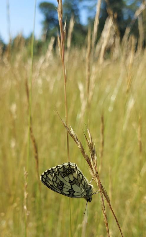 Eben beim Gießen bin ich fast draufgetreten, auf der Treppe saß reglos ein Schachbrettfalter, zum Glück mit ausgeklappten Flügeln, so dass ich ihn noch rechtzeitig bemerkt habe. Auch Anschubsen mit einem Grashalm konnte ihn nicht von diesem Platz fortjagen. Als ich die Kamera holte, klappte er immerhin seine Flügel zusammen und wurde so noch unsichtbarer für eventuelle Jäger: