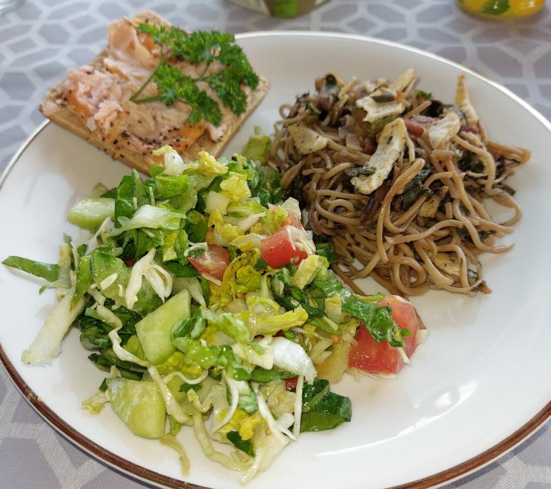 Mie-Nudeln mit Räuchertofu, Zucchini, Champignons und Tomaten, dazu gemischten Salat