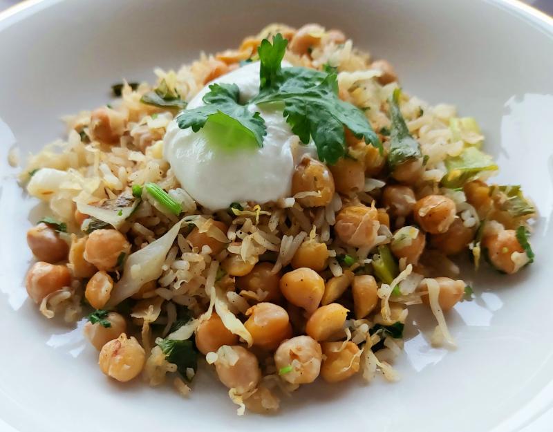 Gebratener Reis mit Knoblauch, Ingwer, Lauchzwiebeln, Kichererbsen, Spitzkohl und frischem Koriander, dazu Knoblauchquark und Romanasalat