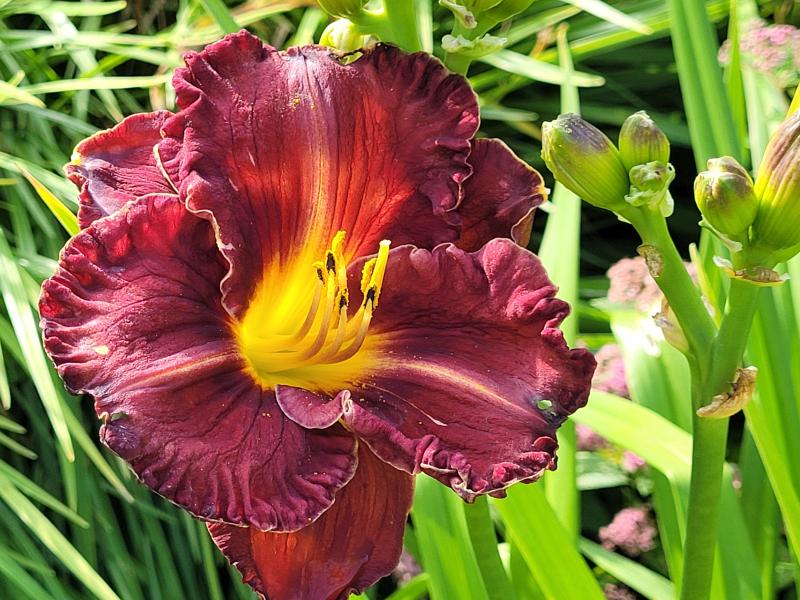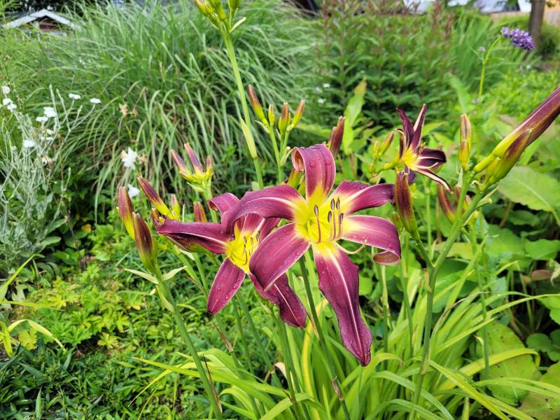 Inmitten der Iris taucht diese einsame Taglilie auf. Nur ein Stängel. Weder weiss ich den Namen, noch wie sie dorthin gekommen ist. Kennt jemand sie?