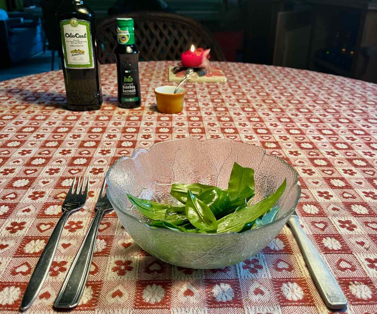 Zum Gründonnerstag Vorspeise Bärlauchsalat aus dem Garten mit Kern- und Olivenöl, Hauptgerichte grüner Spargel mit Dattelsirup, Chili, Knoblauch und Zitronensaft gebraten sowie Drillingskartoffeln gedämpft und mit Rosmarin und Butter serviert zur "Petite Révolution"