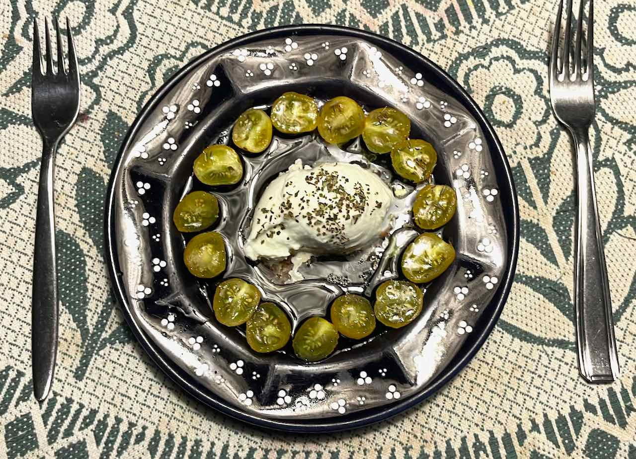 Vorspeise Caprisalat mit Büffel-Mozzarella und gelben Kirschtomaten, Hauptgericht Fusilloni mit Pesto rosso zum Appassimento 2021 aus Salento
