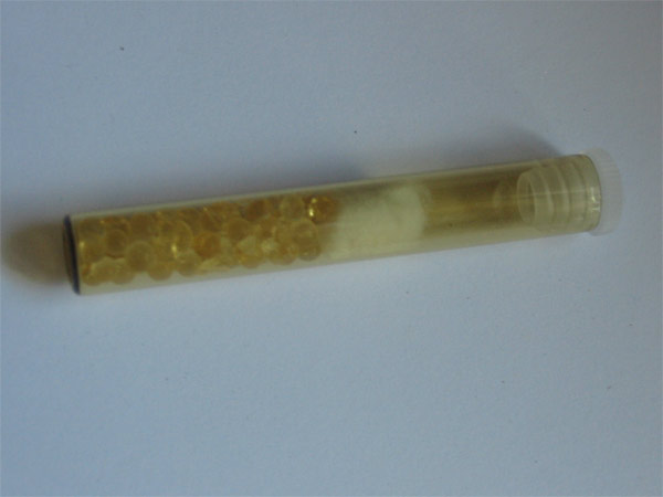 Ich benutze das Orange-Silicagel , der Farbumschlag erfolgt nach farblos. Im Backofen oder auch der Mikrowelle kann es dann aber wieder getrocknet werden und ist dann wieder orange.Und so sehen sie mit Silicagel und Watte aus.