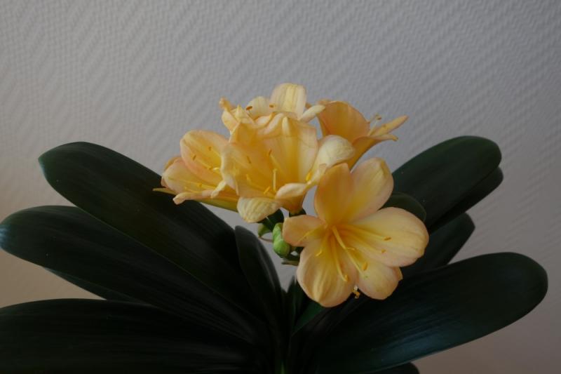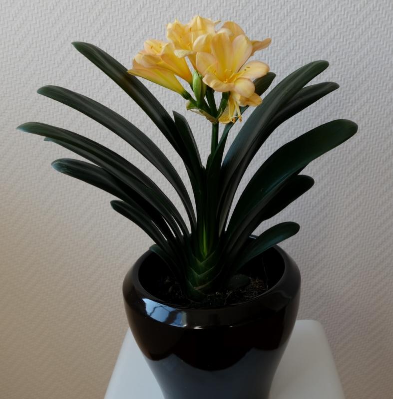 Nr. 100 ist heute mit der Post gekommen! Ich konnte nicht widerstehen, da ich immer eine kleinere gelb blühende Klivie gesucht habe. Meine anderen Klivien mit gelben Blüten sind alle recht groß, zwischen 50 und 60 cm Höhe.Diese kleine Klivie ist ohne Topf bis zum Ende der Blüten 27 cm hoch. Die Blüten sind gelb und ganz zart rötlich überhaucht.