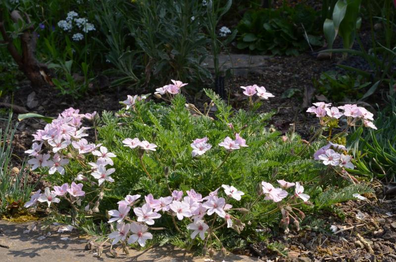 Als sehr gut trockenverträgliche Randbepflanzung könnte ich mir auch Erodium absinthoides var. amanum sehr gut vorstellen. Die habe ich mir letztes Jahr bei Algäu-Stauden bestellt und bin ganz begeistert! Sie hat gerade ihren zweiten Blütenschub hinter sich und sieht sehr proper aus.