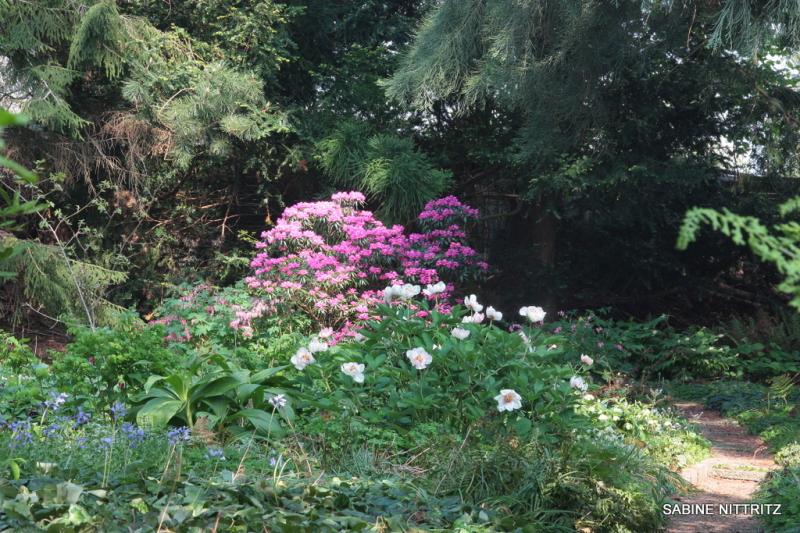 hier unser Rhododendron roxianum x ponticum Graciella, davor ein Sämling einer Päonia mlokosewitschii