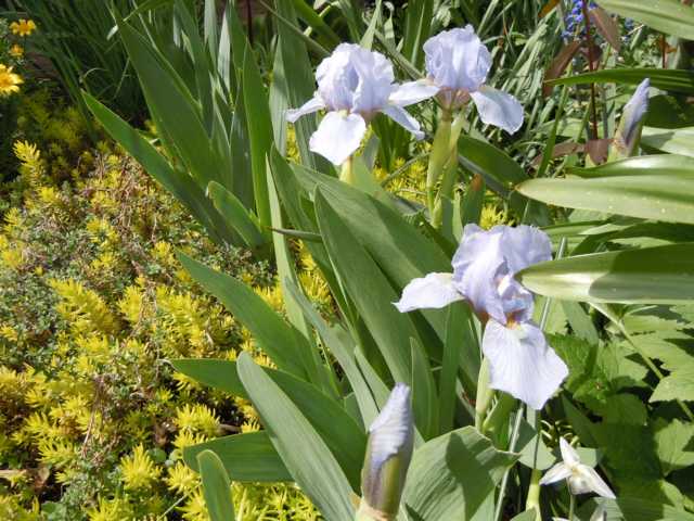 Der Kies ist bei mir mittlerweile fast flächendeckend zugewachsen.Iris *hellblau* mit Sedum "Angelina"
