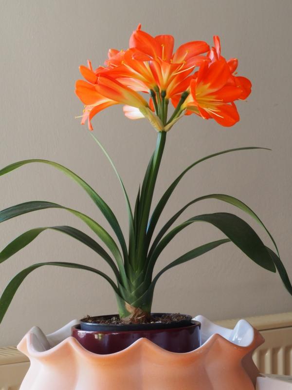 Wunderschöne Pflanze! Meine ältesten gelben sind gut dreimal so hoch.Nr. 100 ist heute mit der Post gekommen! Ich konnte nicht widerstehen, da ich immer eine kleinere gelb blühende Klivie gesucht habe. Meine anderen Klivien mit gelben Blüten sind alle recht groß, zwischen 50 und 60 cm Höhe.Diese kleine Klivie ist ohne Topf bis zum Ende der Blüten 27 cm hoch. Die Blüten sind gelb und ganz zart rötlich überhaucht.