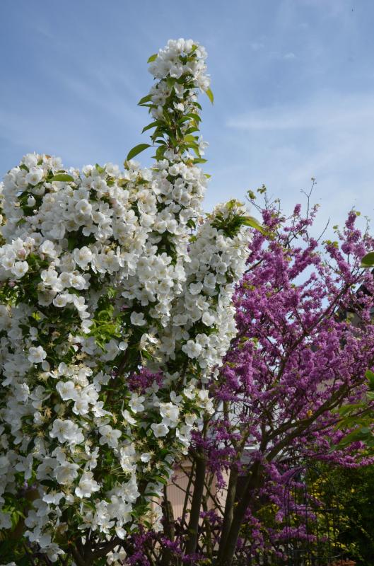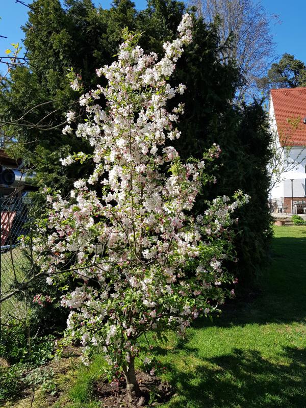 Da kann ich nur einen Zierapfel bieten, weiter hinten Eiben, Aprikose und ganz hoch eine Buche.