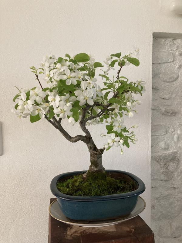 Auch ein Apfel, Bonsai der jedes Jahr üppig blüht und fruchtet. Wird dann reingeholt, damit er im Frühjahr keine Erkältung bekommt.