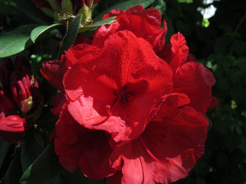 Eine der wenigen hoch wachsenden, sehr winterharten, in einem reinen Rot blühenden Rhododendron-Hybriden. Leider kenne ich weder Ursprung noch Namen. Das einst winzige Sträuchlein war ein Geschenk. Inzwischen ca. 2 m hoch. Da er steril ist (was die Lebensdauer der Blüte verlängert) lässt er sich nicht aus Samen vermehren. Auch Stecklinge waren bislang ohne Erfolg.