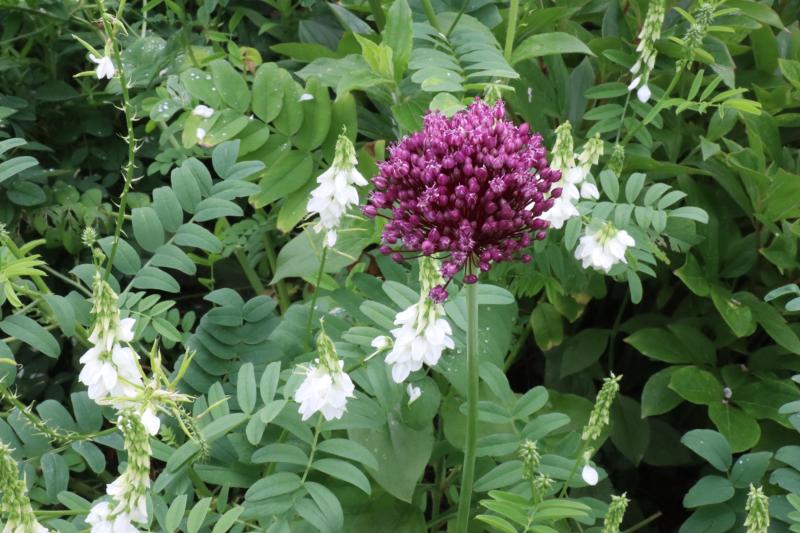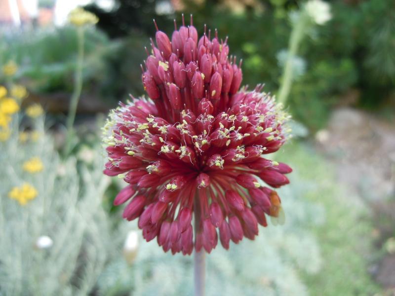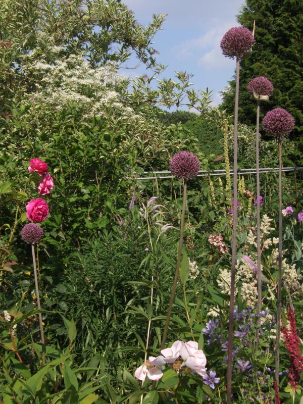 Die Sorte schien auf die Wühlmäuse einen besonderen Reiz auszuüben - im Herbst trieb das Allium ampeloprasum - ähnliche Laub meterweit entfernt an verschiedenen Standorten aus. Die einzige Blüte dieses Jahr, die ich der Sorte zuordnen könnte, tauchte jetzt 5-6 m weit vom ursprünglichen Pflanzplatz auf, die Pflanze ist nur halb so hoch wie die letztjährigen. Ein Mini - Drummer?