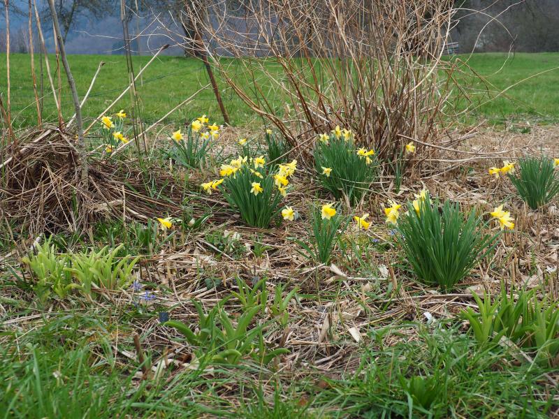 und zwischen den Stoppeln von Pleioblastus viridistriatus die Narcissus pseudonarcissus Lobularis. Euphorbia palustris ist noch nicht zurückgeschnitten.