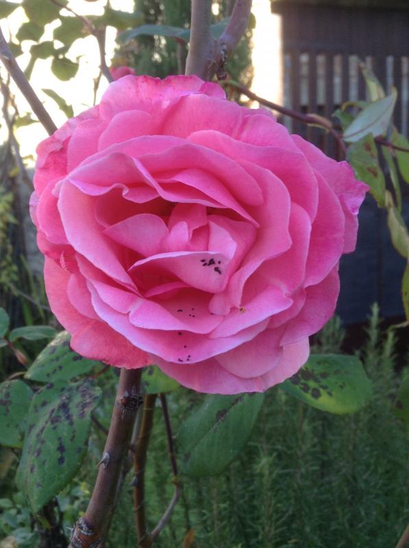 Frau O. Plegg, hier schlank und wüchsig bei etwa 1,5 Meter. Und erstaunlicher Weise sehr gesund! Ist ja bei Rosen mit tief dunkelroter Farbe und starkem Duft nicht immer der Fall ;).