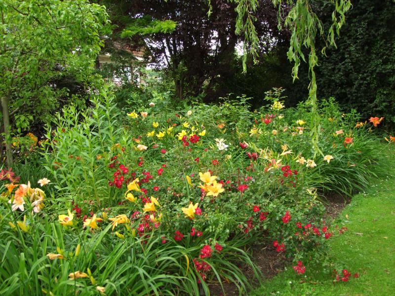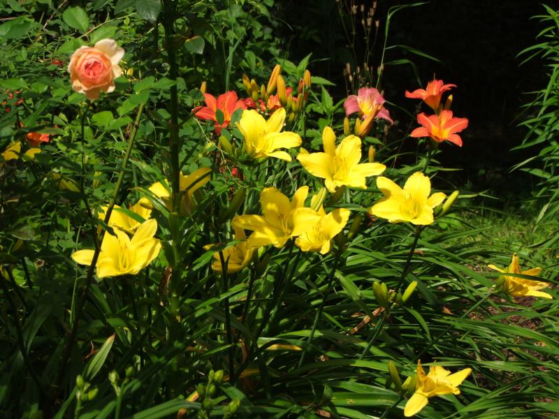 Das Sonnenuntergangsbeet im unteren Garten hat hinter der Trauerweide nur noch ganz kurzfristig Sonne und die Taglilien lassen dort deutlich nach mit der Blütenfülle.