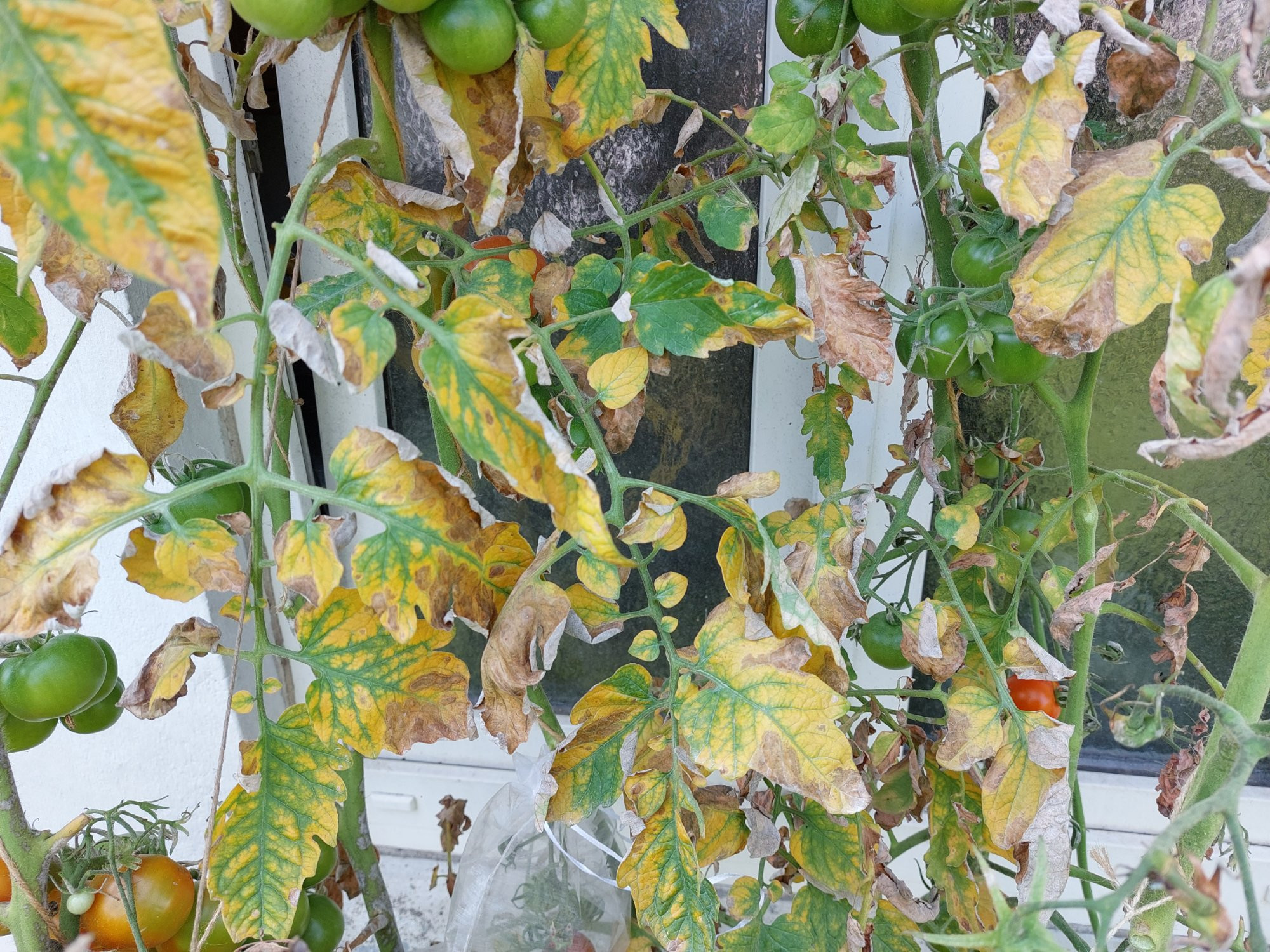 Hier war eigentlich nur wenig Regen, hätte ruhig etwas mehr sein dürfen. Deshalb verstehe ich das auch nicht ganz. Ob es nun hauptsächlich am starken Mehltau-Befall liegt oder an anderen Pilzen, keine Ahnung. KBF ist nur an einigen wenigen Pflanzen, soweit ich das erkenne. Im Gewächshaus sieht es auch nicht viel besser aus als draußen. (Bilder von draußen unter dem Vordach, Bild 2 ist Mehltau jedenfalls und Bild 3 KBF)