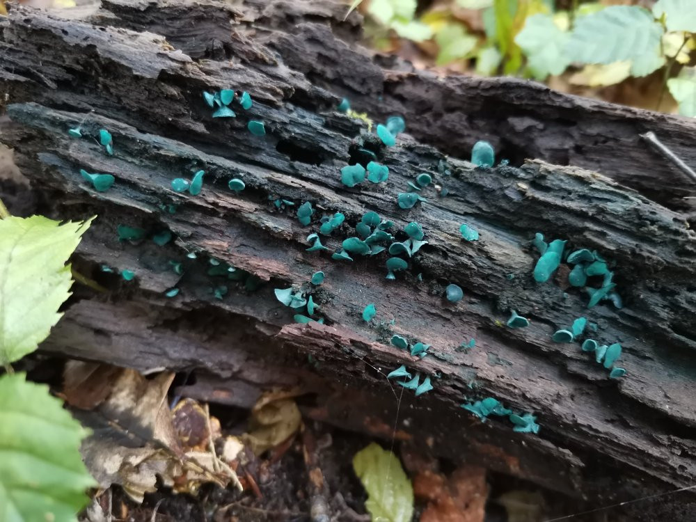 Normalerweise kommt dort ja so gut wie nie Wasser hin, aber dieses Jahr ist selbst diese Ecke direkt auf dem Wurzelteller der Fichte offenbar ziemlich durchfeuchtet, so dass das Totholz und die Fichtenstreu dort nun nach und nach verrottet und Humus bildet.