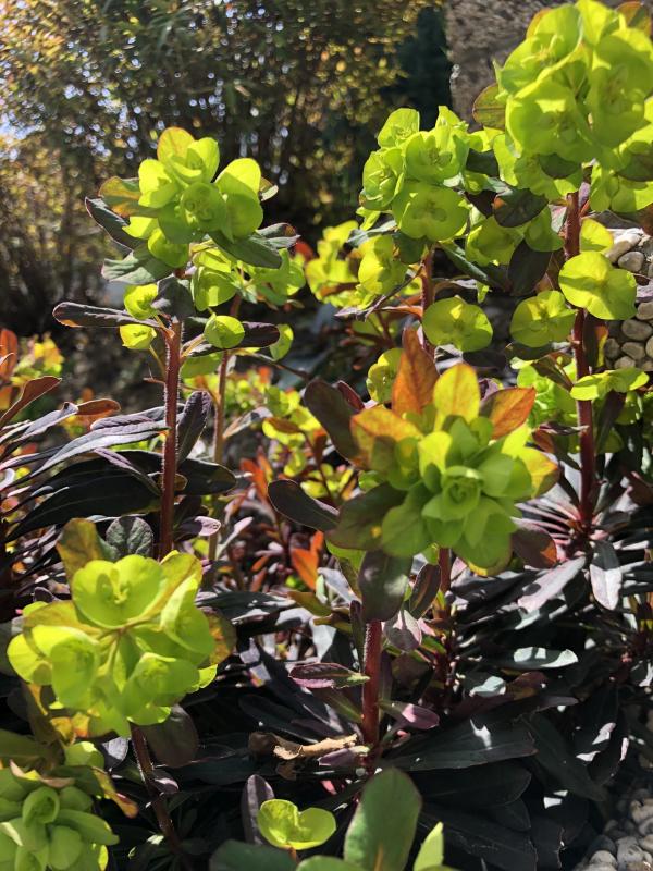Die amygdaloides ‚Purpurea‘ hab ich aufgegeben, die hält zwei, bestenfalls vier Jahre, dann ist die weg, nur geringe Aussaat. Dafür versamt sich seit 2018 auf einmal characias - auch ganz nett. Robbiae ist inzwischen ein zuverlässiger Partner in vielen Pflanzungen, wuchert etwas, aber das kriegt man in den Griff.