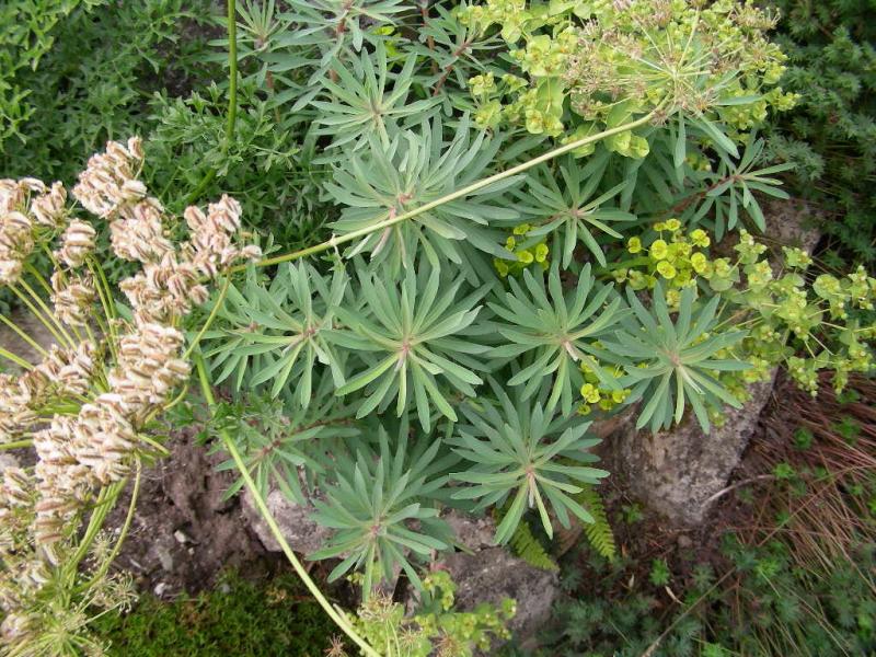 Interessant find ich nicaensis, die hier ganz anders aussieht als auf den Internetfotos, gar keine Ähnlichkeit zu myrsinites, aber auch graues Laub. Leider sehr lahm….