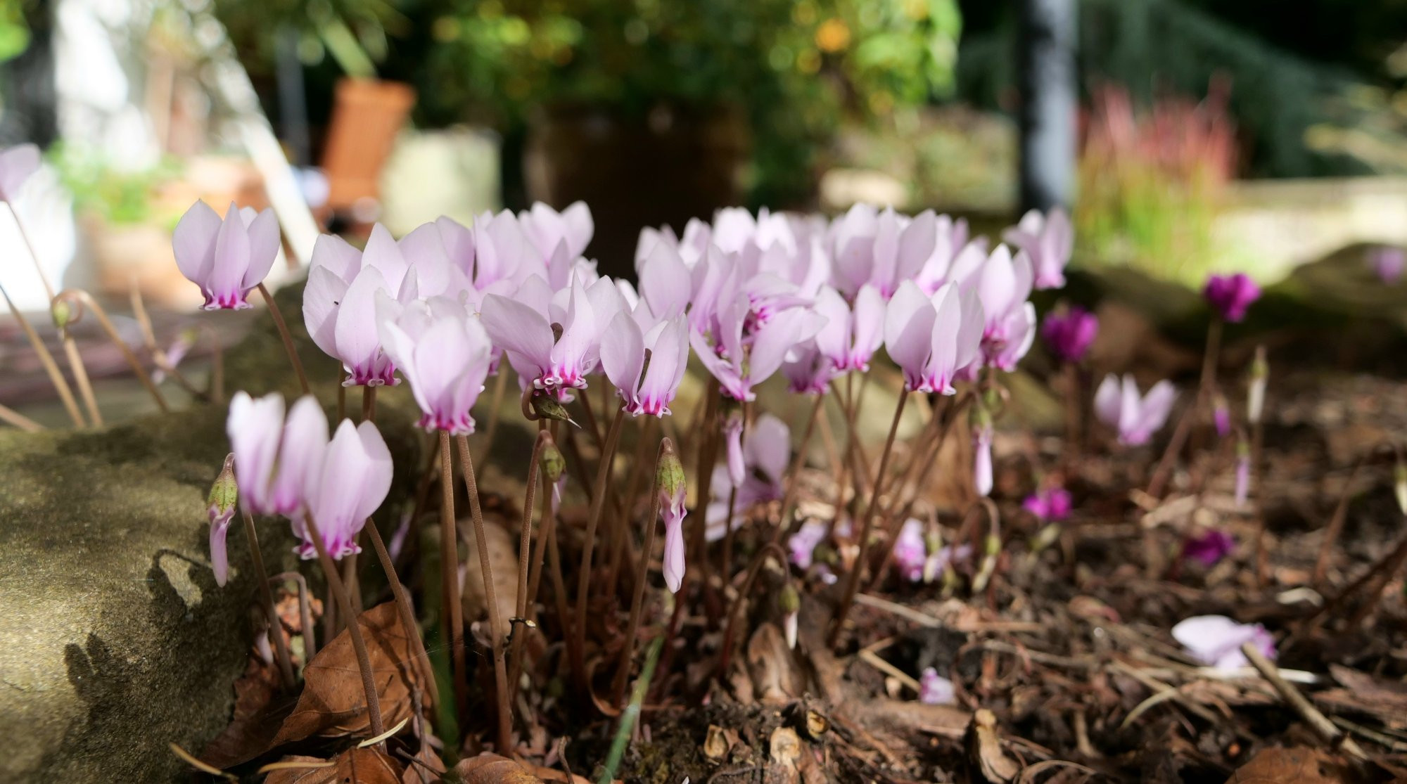 Unverhofft kam mir dann ein kurzer Windstoß zu Hilfe, der die Halme des Japanwaldgrases lupfte und einen besseren Blick auf die vielen Blüten der Cyclamen erlaubte: