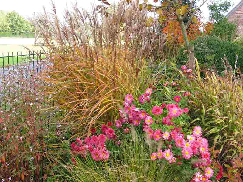 Troll, die Kombination ist wunderschön, wie heißt die Chrysantheme?Miscanthus sinensis 'Ferner Osten' hat jetzt richtig seine kupfrige Herbstfärbung angenommen.
