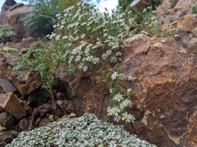 Aster speciosus "Connecticut" im Steingarten. Wenn man sie mit der Schere kurz hält sollte es funktionieren...