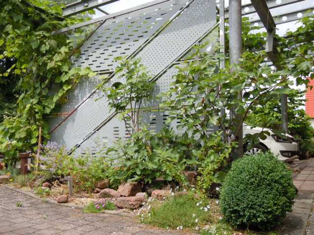 Bei deinem Bild habe ich jetzt weniger auf die Pflanzen, also auf die die tolle Carportwand geschaut. Das ist doch mal was ganz anderes, als die üblichen Modelle. Und ein interessanter Hintergrund für die Bepflanzung!LG Arianejo, leider hab ich nicht diese sonnige weite, die deine herrlichen Pflanzungen zu bieten haben. bei mir sind das wenige kleine beetchen in der sonne, der restliche garten ist schattiger.hier mal mein feigenbeet im vorgarten an der südwestseite des Carport.die säckelblume "gloire de Versailles" hat ihre duftigen büten geöffnet.