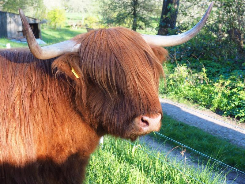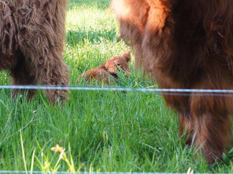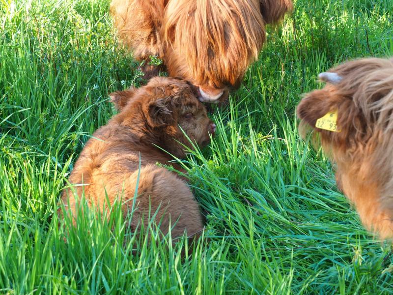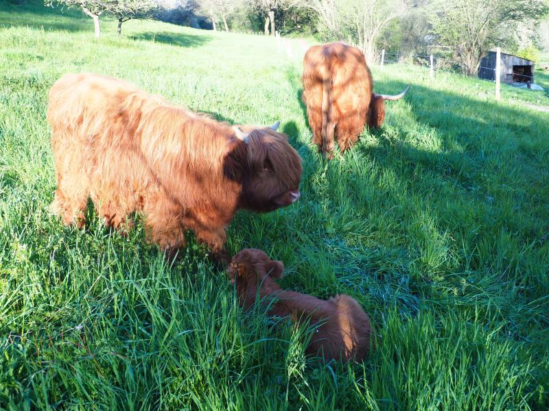 unterwegs musste ich halten. Ein Kälbchen. Direkt oberhalb vom Wiesengarten vor dem Waldrand steht Schottisches Hochland.