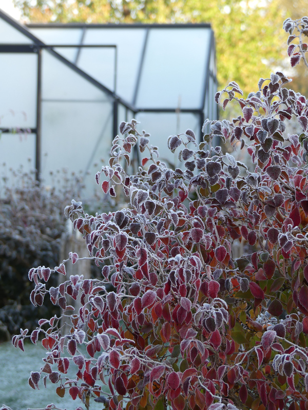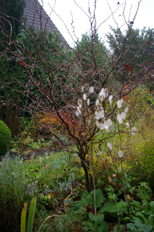 Der Strauch ist ein Prunus incisa "Kojou-no-mai, ein wirklich schönes Gehölz, nicht nur die Herbstfärbung. Im Winter sieht man die dekorativen, zick-zackförmigen Äste und im Frühling blüht er zartrosa.