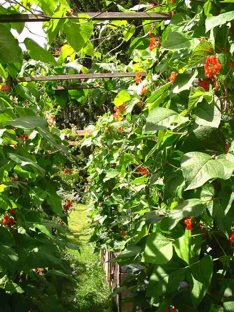 Der Feuerbohnentunnel, die ersten Blütenansätze sind ohne zu fruchten abgefallen, vielleicht war es zu warm oder zu trocken, eigentlich ist das anfangs jedes Jahr so. Aber jetzt sehe ich die ersten Ansätze kleiner Böhnchen.