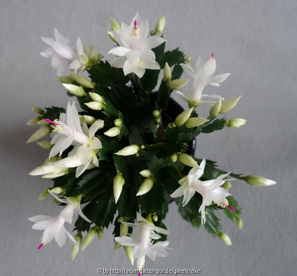 gut eingepackt und mit der richtigen Adresse versehen, schaffen auch die niedlichen Kleinen die Fahrt von Holland nach Deutschland oder gar Österreich.Mir gefallen die etwas breiteren Blütenblätter Deines gelblichen Weihnachtskaktus sehr gut. Jetzt werde ich bei diesem im letzten Jahr reinweiß blühenden Weihnachtskaktus das Aufblühen der nächsten noch sehr kleinen Knospen abwarten, wenn sie denn erblühen und nicht vorher abfallen. Ich habe für dieses Foto extra ein graues DIN-A4-Blatt als Hintergrund verwendet, um die genaue Farbe zu zeigen. Wenn diese Blüten ebenfalls eine rosa Röhre haben, bekommt diese Pflanze ab Anfang September nächsten Jahres Hausarrest. Ich möchte die Blüten gern so reinweiß haben,