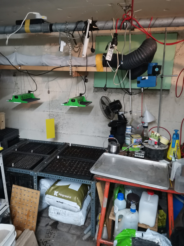 Ansonsten ist die Werkbank daneben zum topfen oder säen recht praktisch, die Arbeitsfläche ist ein altes Bäckerbackblech. Auf der Werkbank stehen sonst noch der Rührer um Dünger zu lösen, eine Flasche mit der Düngerstammlösung, entnommen wird für die fertige Gießlösung in der Gießkanne mit einem Dosimat, die Kühlrippen aus einem alten PC sind nicht schlecht um die fertigen Saatguttüten beim säen abzustellen. Unter der Werkbank diverse Dünger, unter dem Anzuchtregal Substratlager. Die Schwermetallregalprofile mit den Löchern, so wie man sie auch bei ringelnatz sieht, die sind schon Gold wert beim basteln und zweckentfremden.