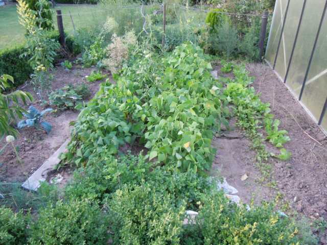 Mein Gemüsegärtchen. Es dorrt schon wieder, lange keinen Regen gehabt.Ganz rechts ist neu gesät. Cima di Rapa und Radicchio "Grumolo verde und Grumolo rossa".Der Grünkohl links mickert. Kohlweißlinge und weiße Fliegen tummeln sich. Die Tomate "Purple Calabash" hält sich im Freiland wacker. Die Buschbohnen sind fast durch mit ernten. Salat "Maiwunder" hat geblüht und geht überall neu auf.