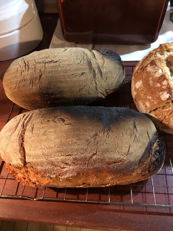 Es war der allererste Brotversuch im Holzofen, dafür ging es. Ich mache später mal ein Bild der Krume und es schmeckt kräftig, wirklich gut. Der Unterschied war die schnellere Gare, eine größere Hitze (der Ofen schafft bis 350 Grad) und tatsächlich das Problem des Runterregelns, beim nächsten Mal muss ich die Backofentür aufmachen und so lange auflassen, bis die Temperatur gefallen ist - alles andere würde zu lange dauern. Außerdem hatte ich die Schale mit den Lavasteinen vergessen und musste Wasser reinspritzen, das war nicht optimal.