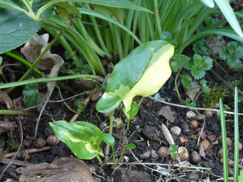 Arum ist schon wieder so weit hinten gerutscht. Aufgrund der niedrigen Temperaturen tun sich A. italicum etwas schwer. Die Winterblätter sind nicht bei allen mehr schön und die neuen brauchen noch etwas Zeit.