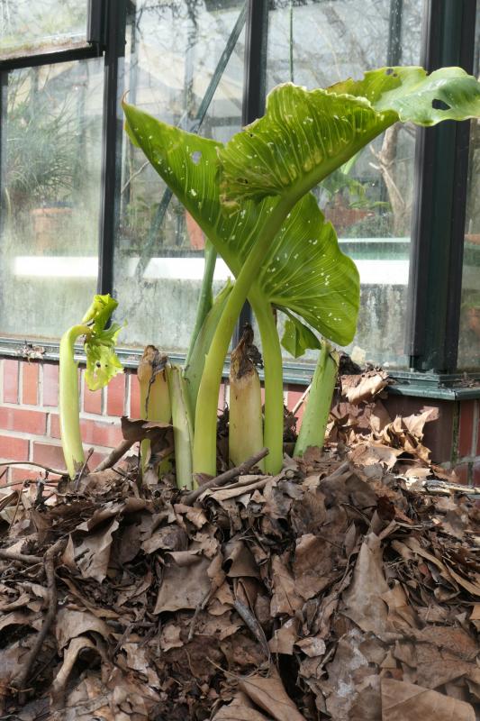 Zantedeschia erholt sich vom Winter unter dem dicken Laubhaufen. Bei Frost kommt noch eine Folie drüber.