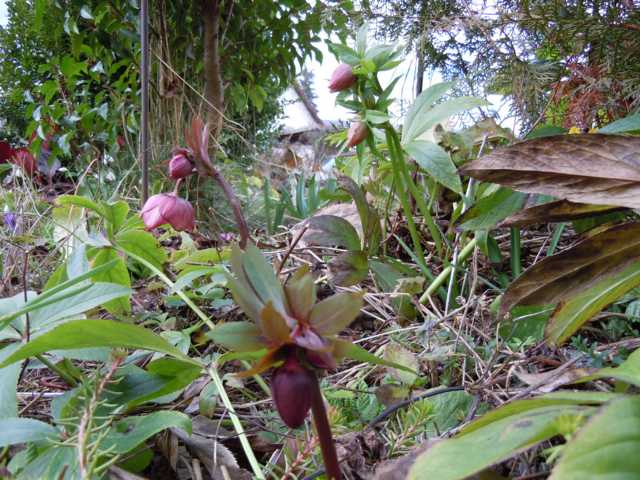 Sind 3 verschiedene Sämlinge. Wenn du links neben der dunklen im Vordergrund schaust, ist teilweise eingezogenes Laub sichtbar. Sind also nicht ganz so wintergrün wie meine übrigen x hybridus. Die Blüten sind auch sehr klein.