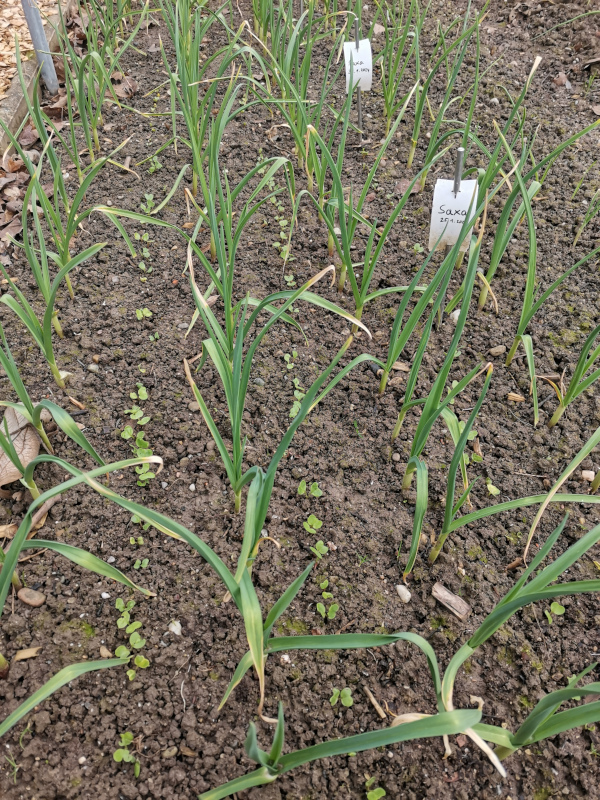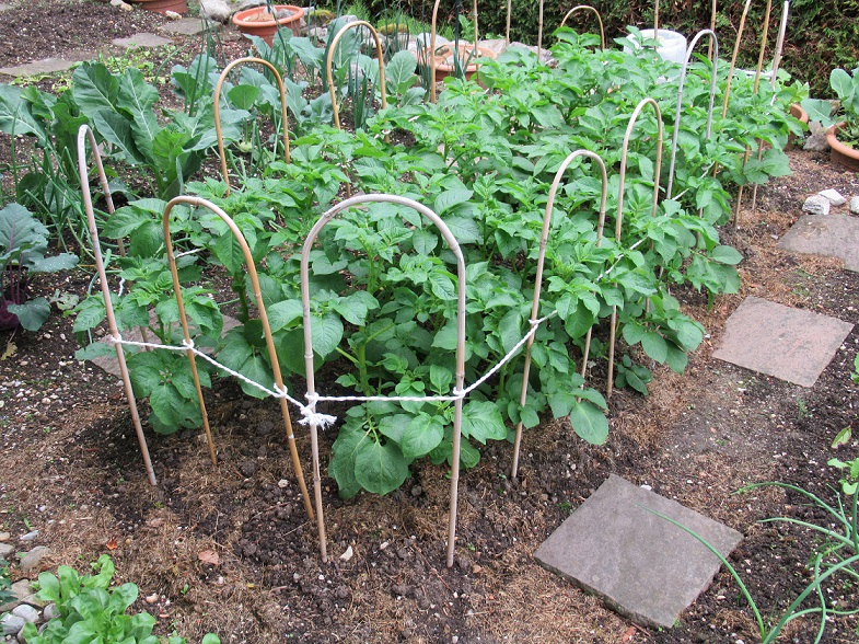 Um zu vermeiden, die nächsten Wochen durch niederliegendes Kartoffellaub einen Tritt suchen zu müssen, habe ich das Beet etwas eingezäunt. Die Blattfarbe übrigens ist heuer sehr intensiv.