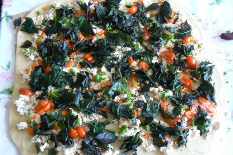 Einer spontanen Idee folgend und in der vermutlich wieder vergeblichen Hoffnung die zweite Gefriertruhe vor dem Sommer leer zu bekommen, habe ich eine Hefeteigrolle mit einer Mischung aus Schafs- und Hirtenkäse, würzig angemacht mit reichlich Kräutern und Knoblauch, bestrichen, darauf das Gemüse und noch einen Beutel eingefrorenen Neuseeländerspinat. Das Resultat war durchaus wiederholenswert.